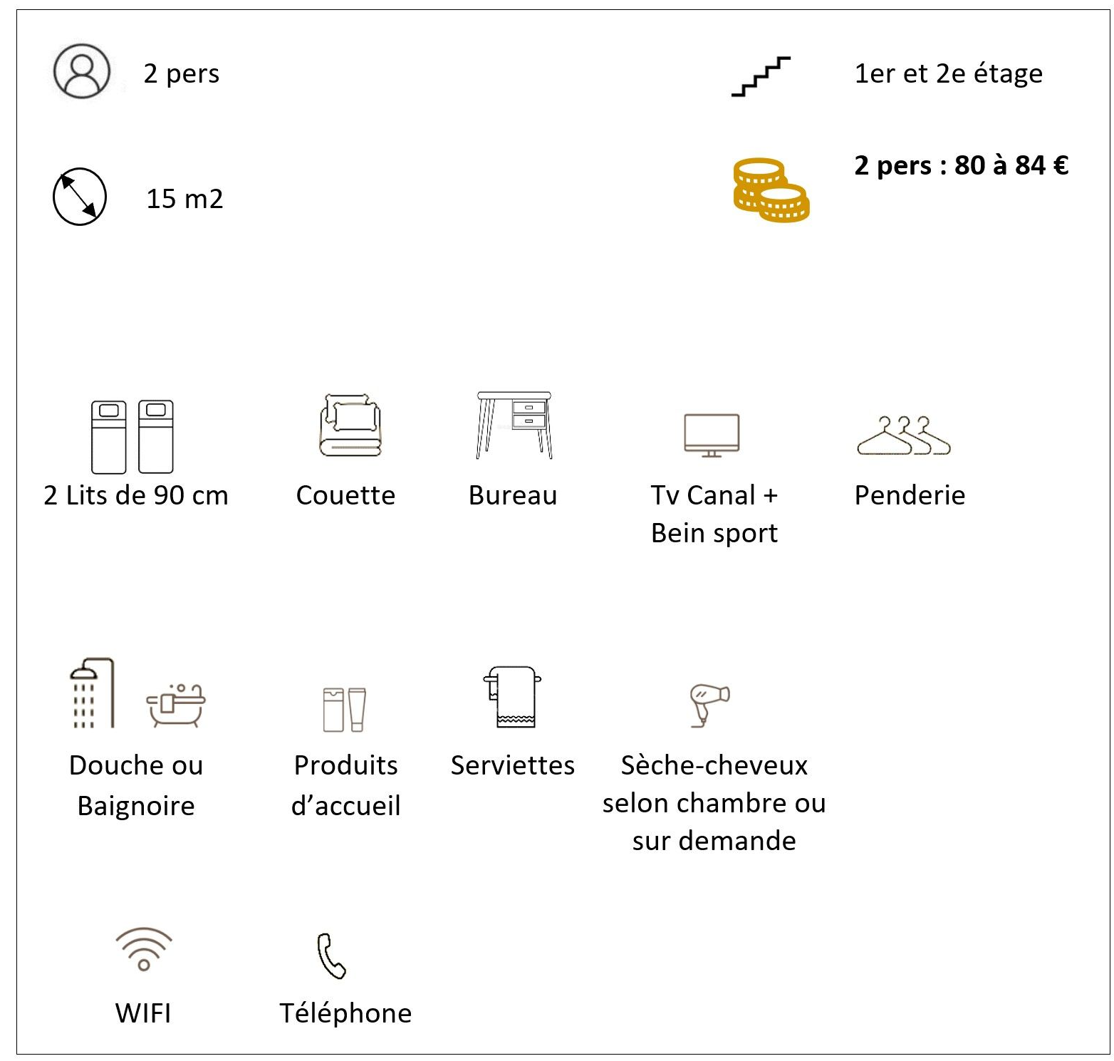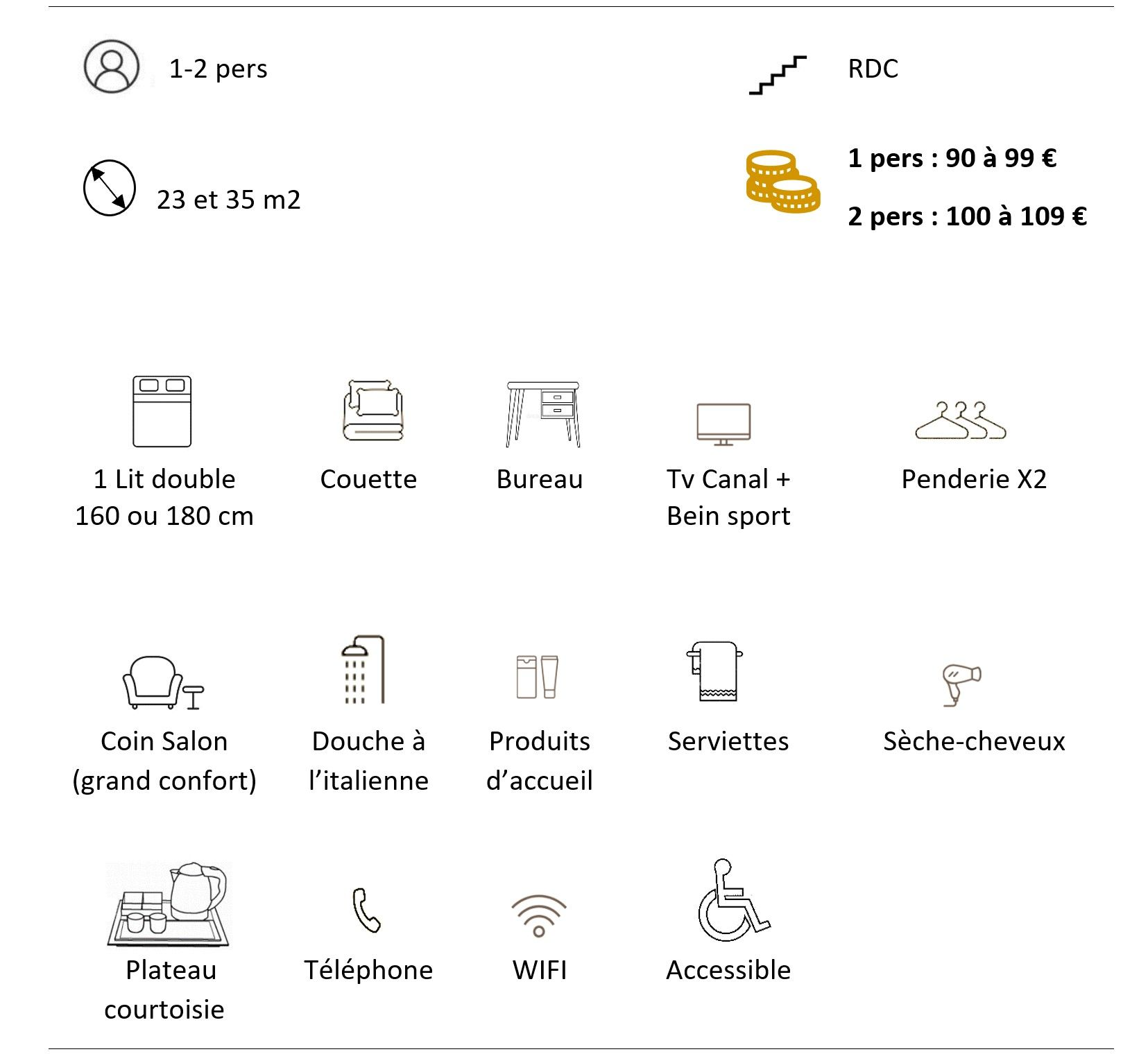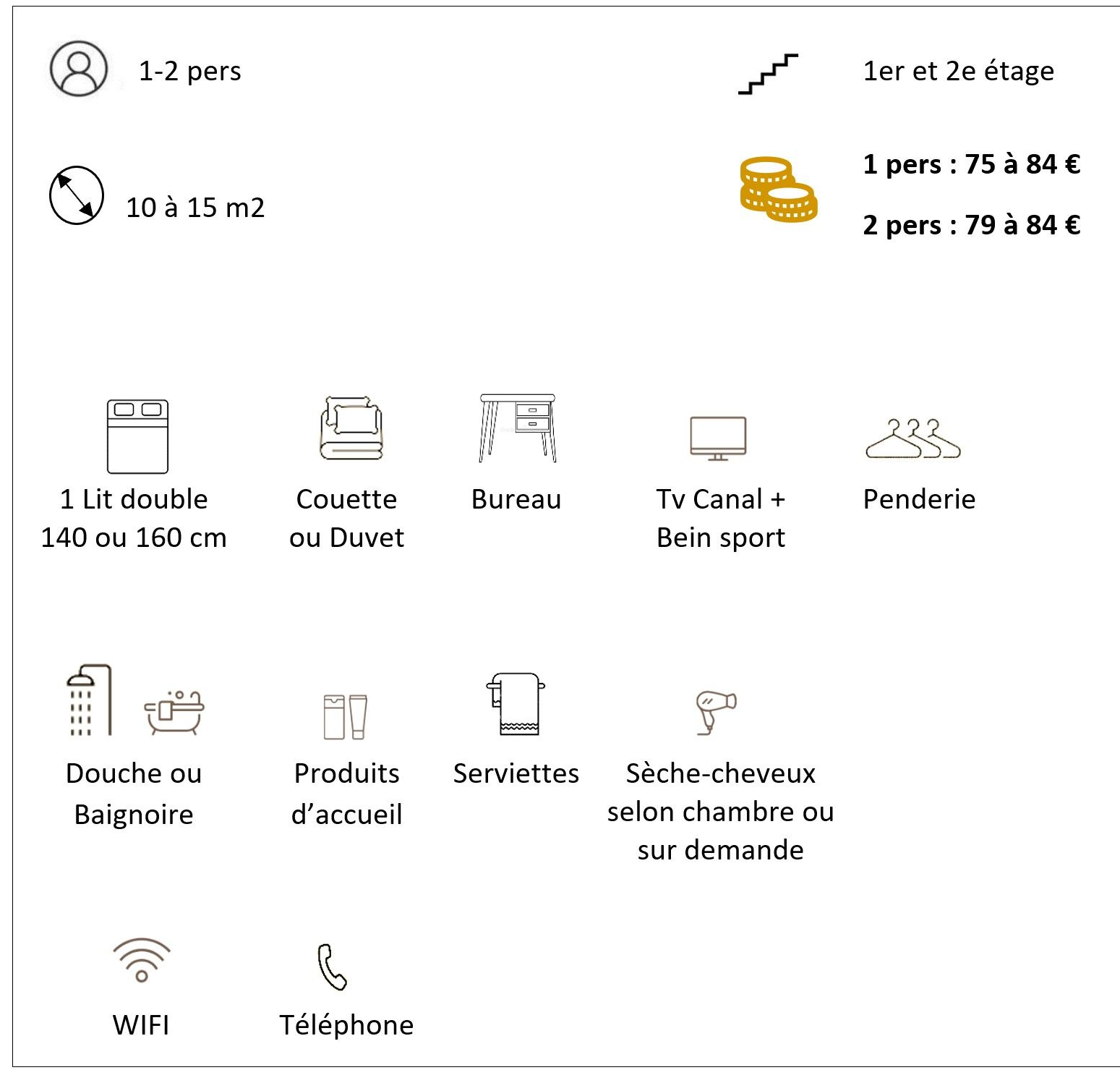 L’hôtel vous propose 21 chambres non-fumeur, au style épuré, réparties sur 3 niveaux sans ascenseur, dont 2 chambres conforts en RDC adaptées à tous.